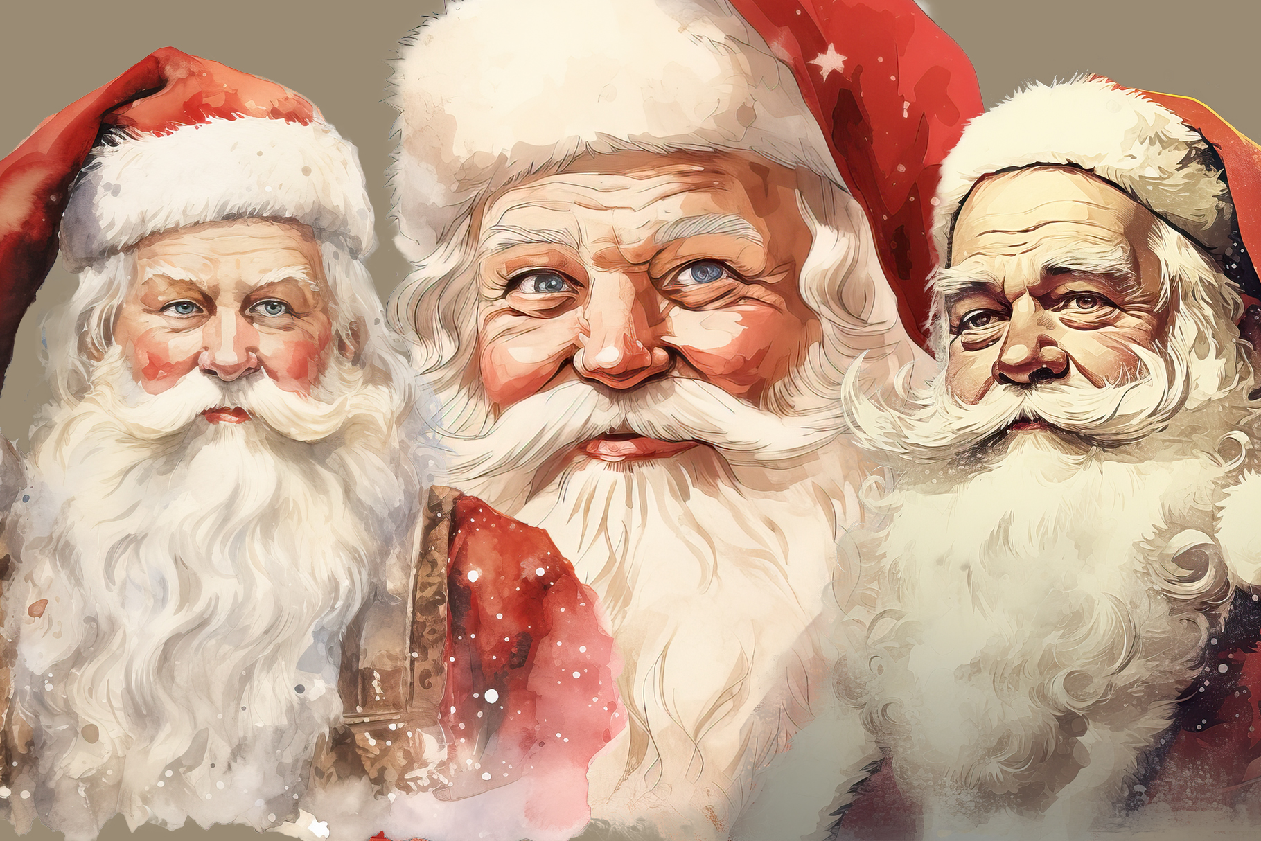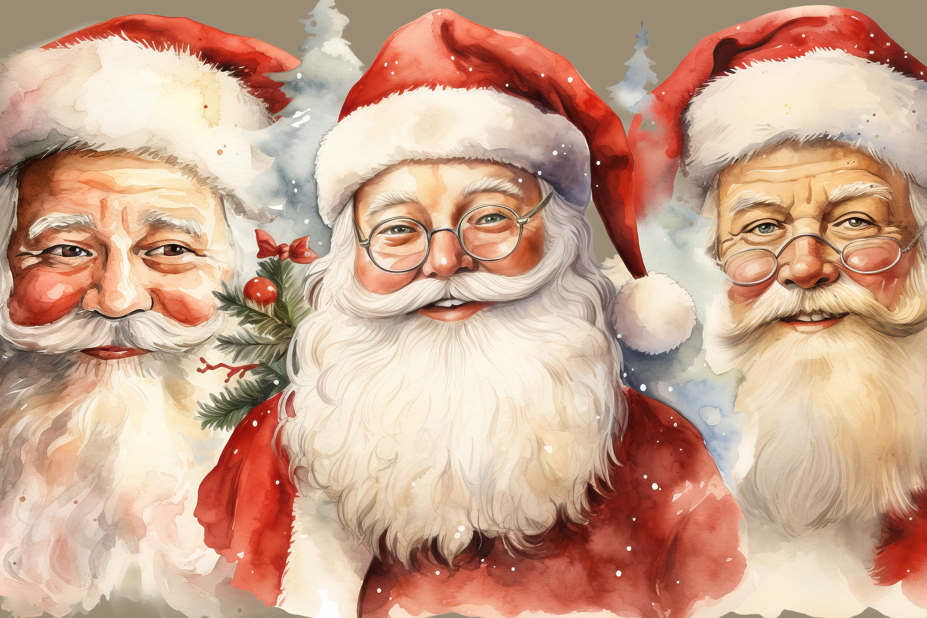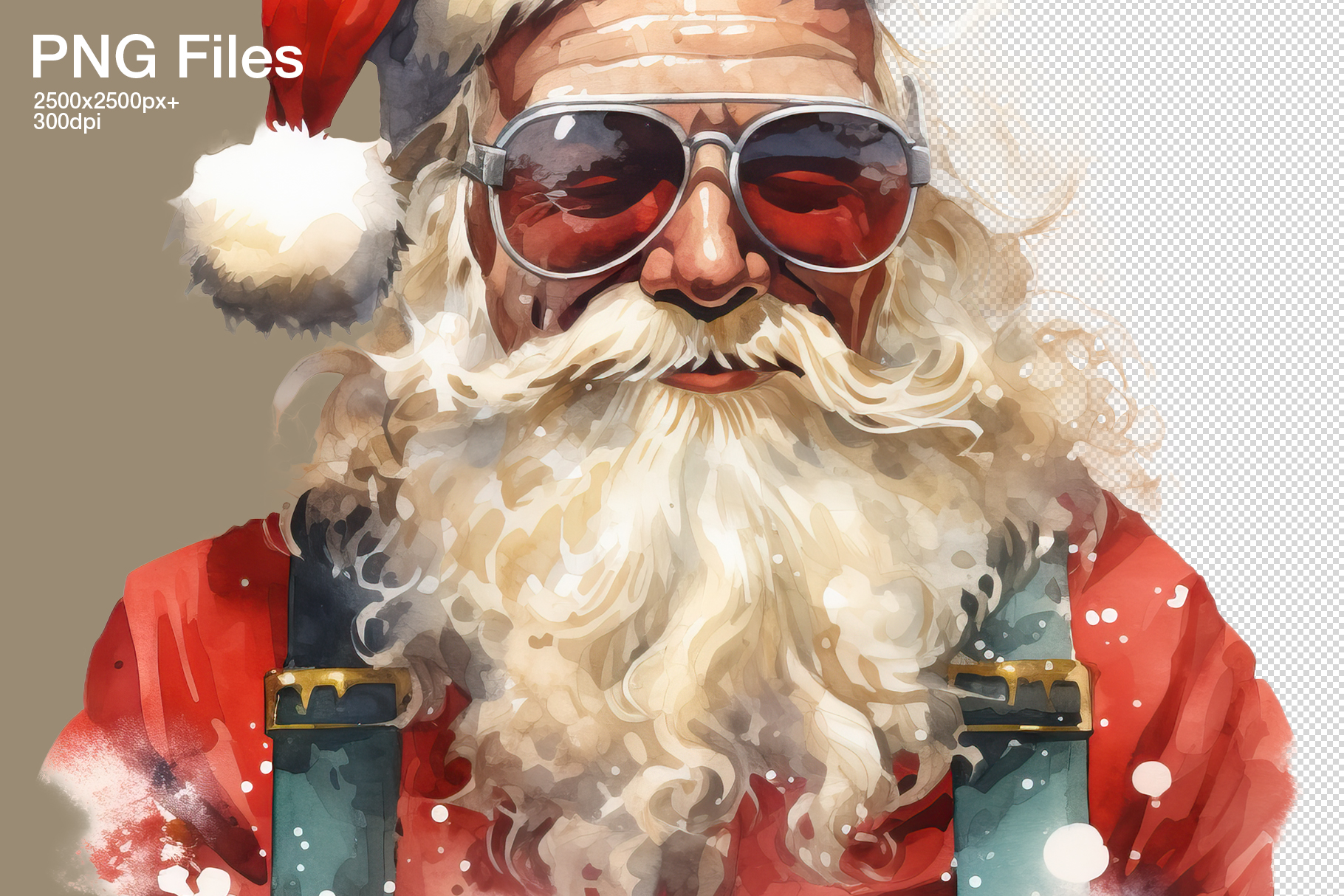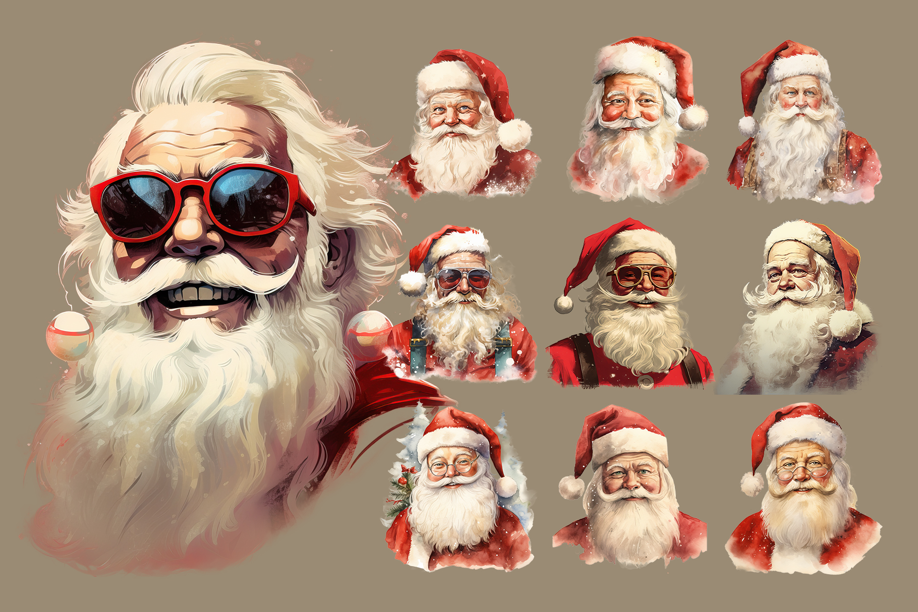 A small collection of 10 high-resolution PNG Santa Claus watercolor illustrations.