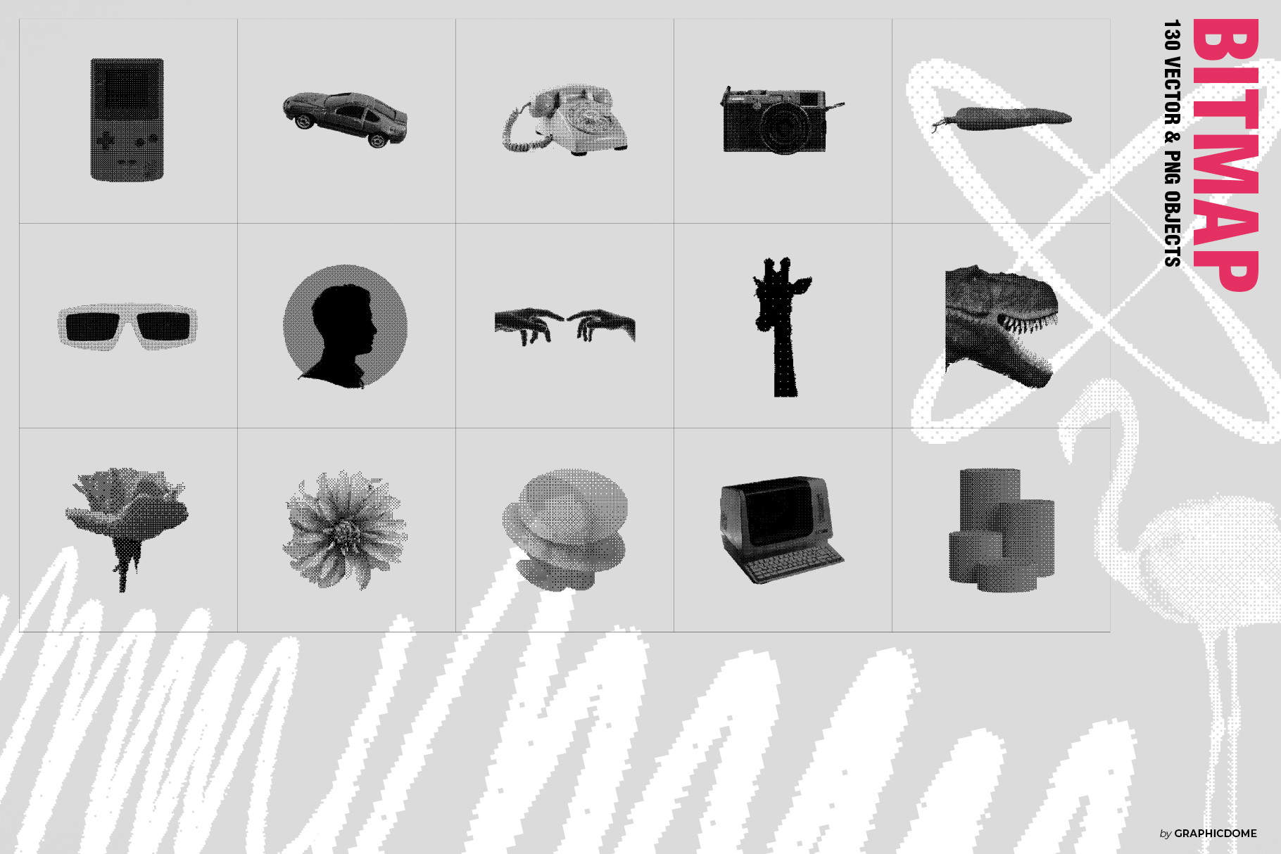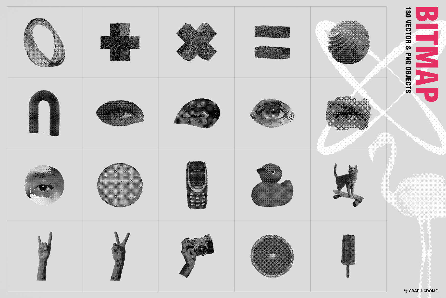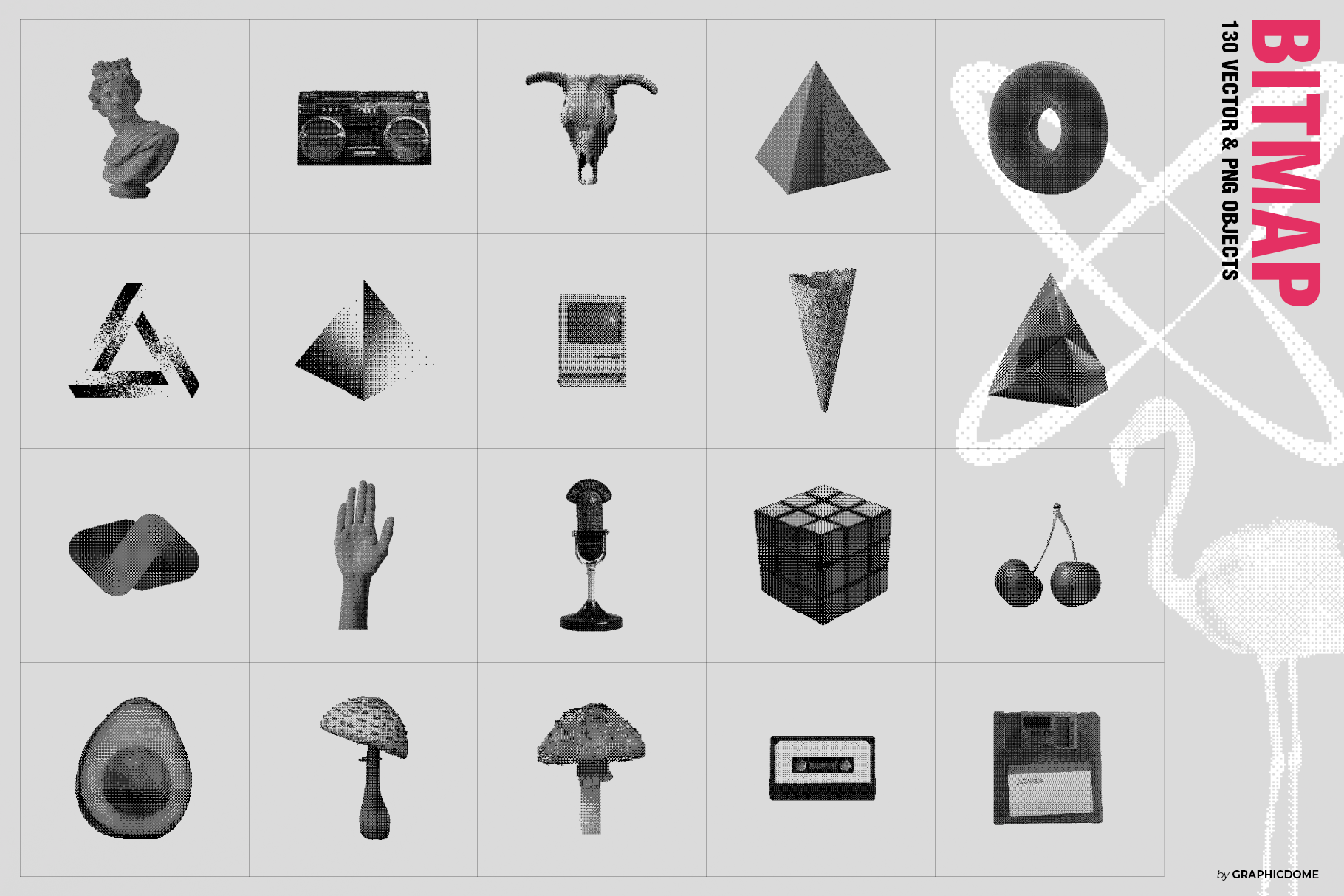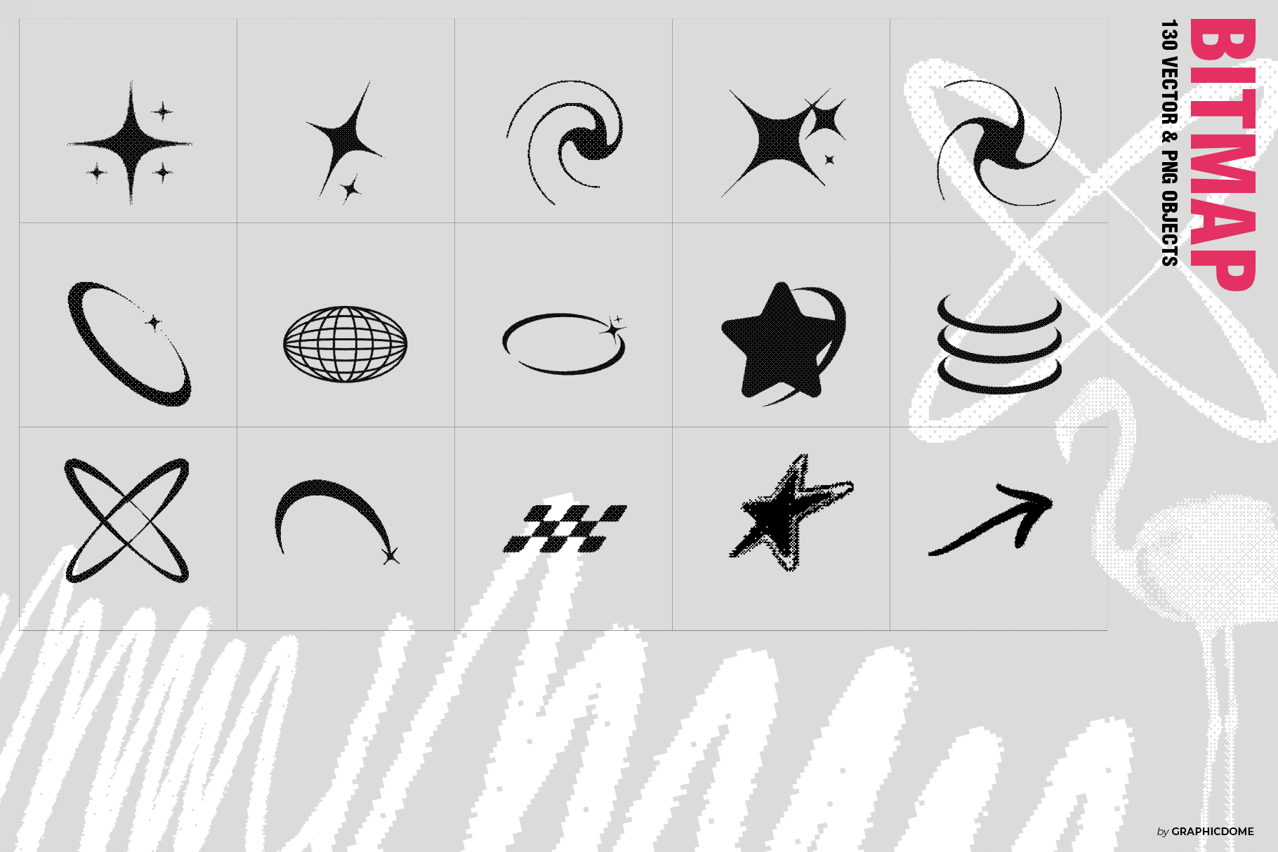 A great collection of 130 vector and PNG dither bitmap retro y2k objects, shapes and elements!