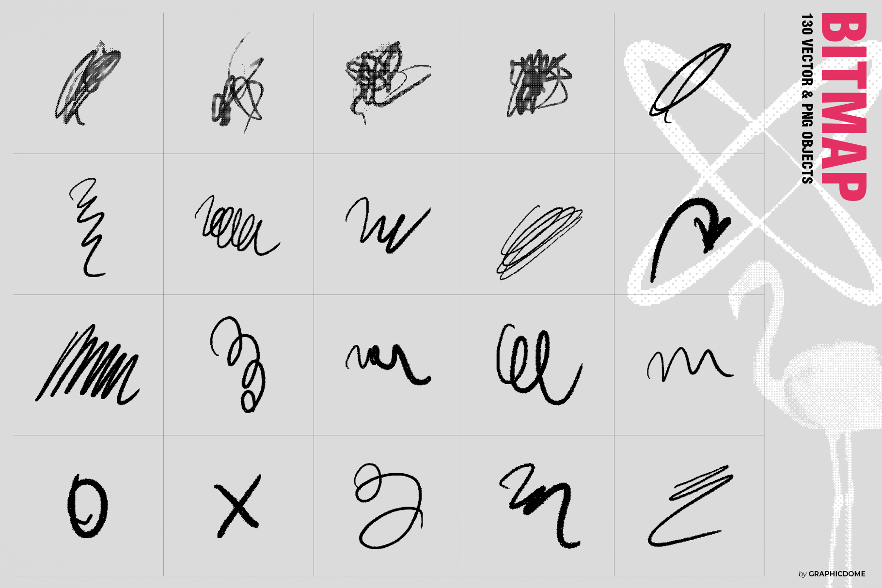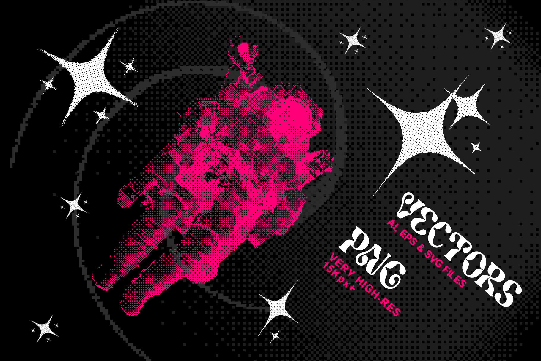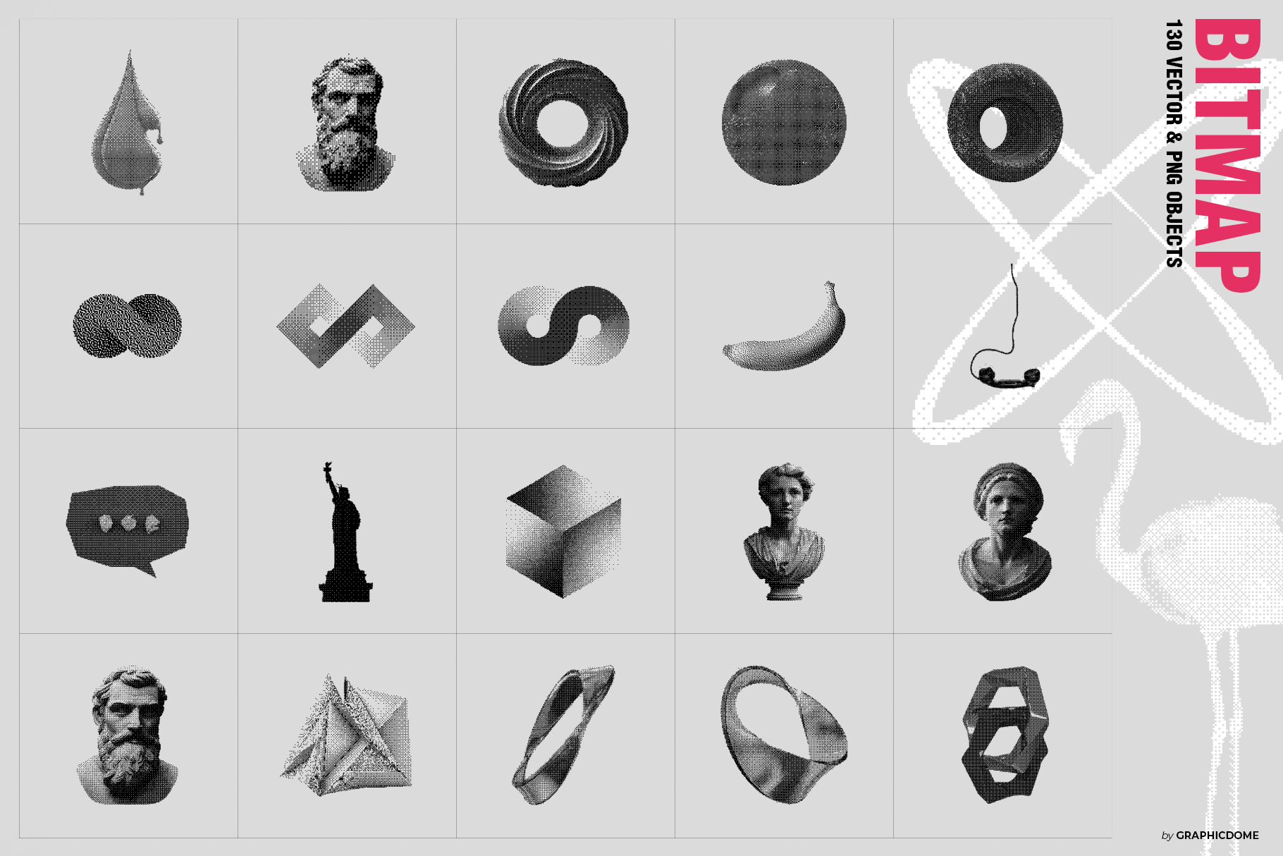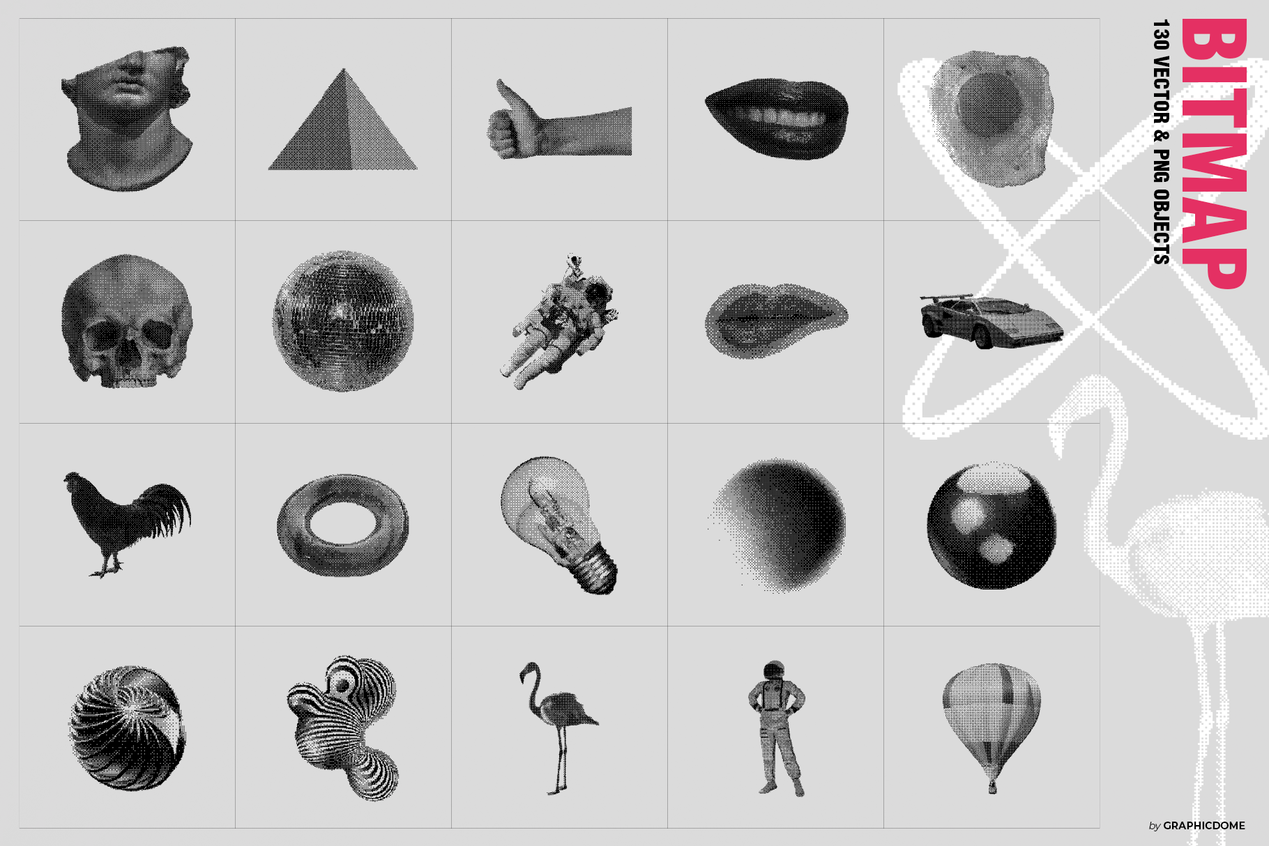 A great collection of 130 vector and PNG dither bitmap retro y2k objects, shapes and elements!