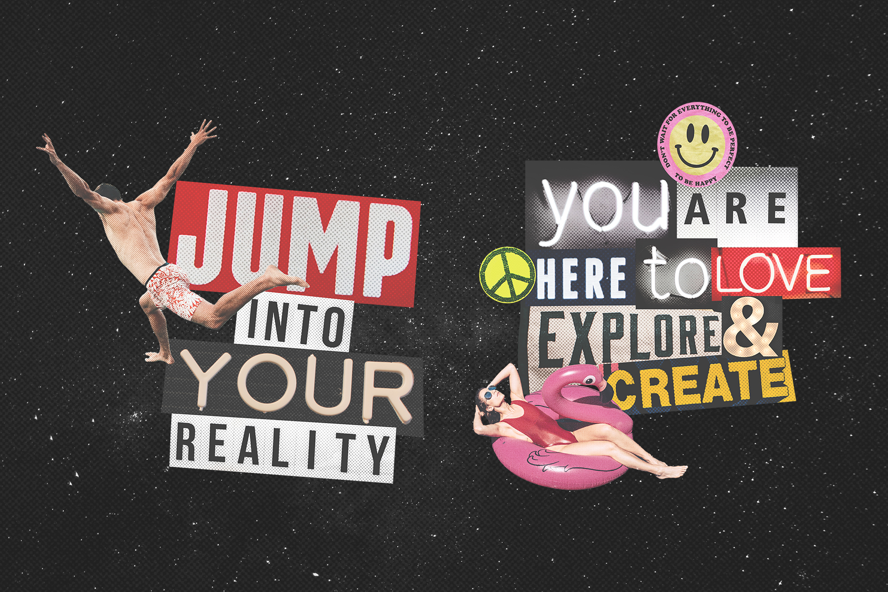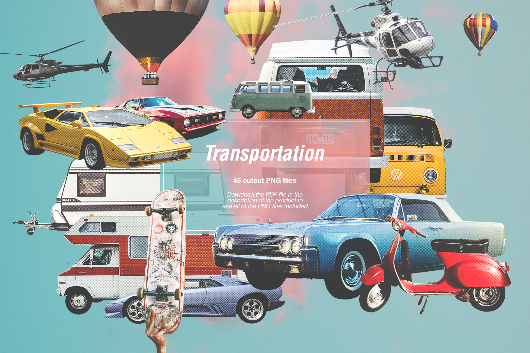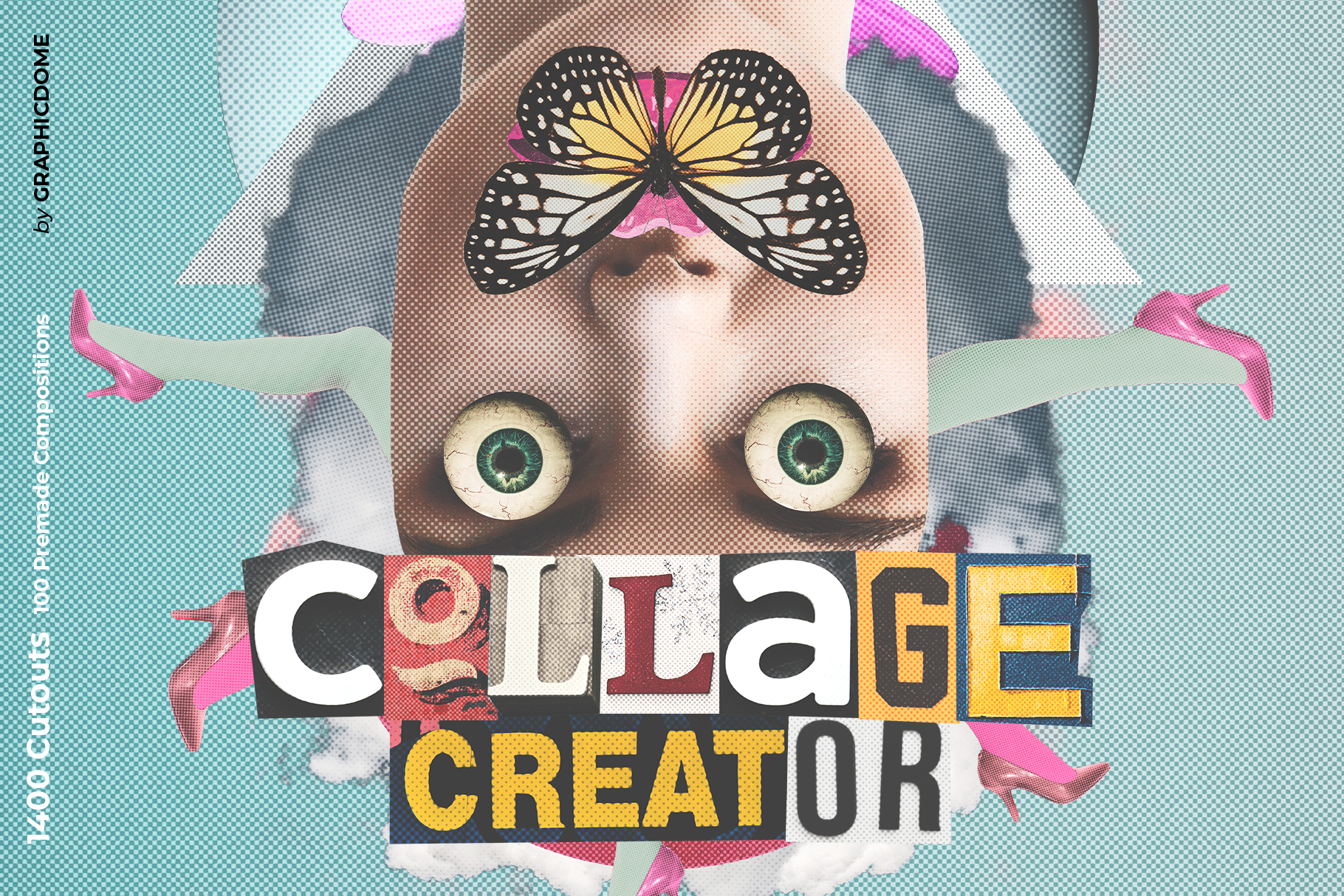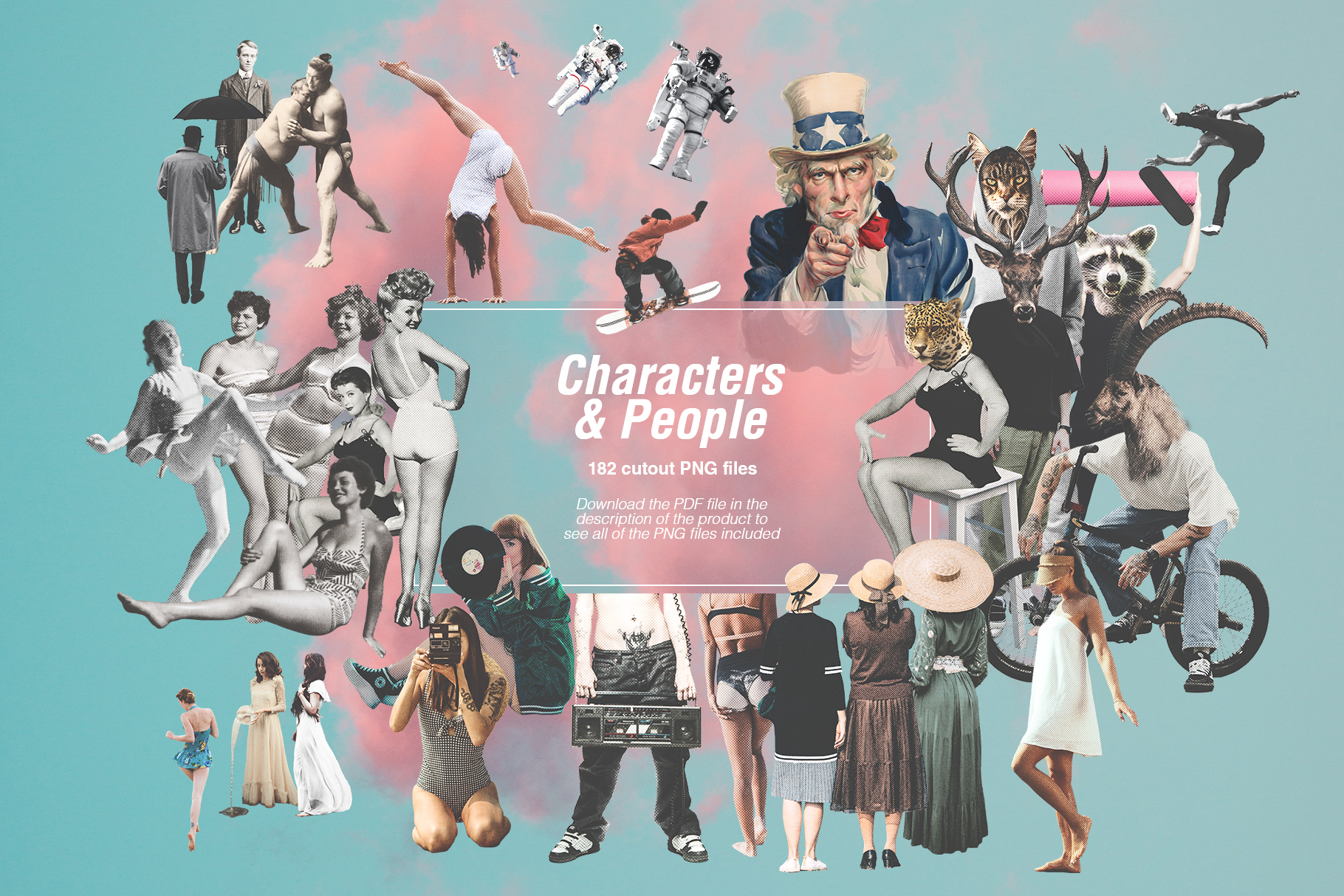 Unleash your inner creativity and design prowess with our Collage Creator, an all-in-one toolkit that empowers you to craft stunning and unique collages. With an extensive library of over 1400 meticulously curated cutouts, this toolkit is your ticket to an infinite world of artistic possibilities. It is packed with everything you can think of - people, plants, landscapes, transportation, animals, letters, and way more. Create collages that match your mood, style, or whatever tickles your fancy!